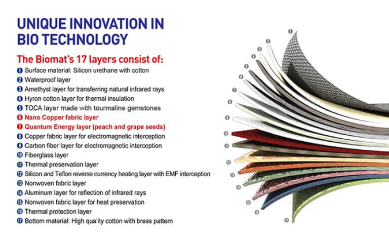 The Biomat 7000MX is constructed with 17 layers to provide its 2-in-1 system. Like other mats, the high quality construction does include a lot of layers reserved for insulation. The following list describes the key layers in the construction of the Biomat 7000MX that makes it an effective FIR mat.