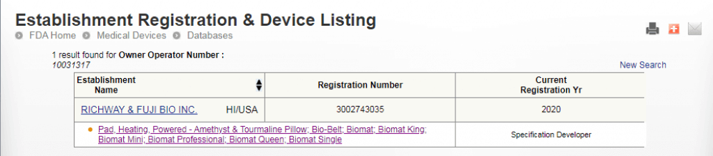 The Biomat 7000MX is an FDA certified (registered) device. This means that the FDA has reviewed the product, and has deemed it safe for consumer use within the United States. Specifically, the Biomat is an FDA Level 2 device, meaning it is safe for use and is not associated with any serious side effects. There is some misinformation on the internet indicating that Biomat is currently not registered with the FDA, and that their previous registration was based on an out-dated product, but on closer examination of the FDA website, all Biomat products have been registered as level 2 devices as of 2020 (see below).
